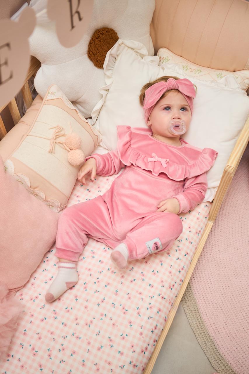 O macacão possui decote arredondado e mangas longas com punho aplicado. Apresenta babado embutido na pala e laço aplicado centralizado acima do babado. Além de etiqueta personalizada da marca aplicada na lateral de uma das pernas, a peça conta ainda com abertura no entrepernas e nas costas, ambas com fechamento por meio de botões de pressão, garantindo praticidade ao vestir.