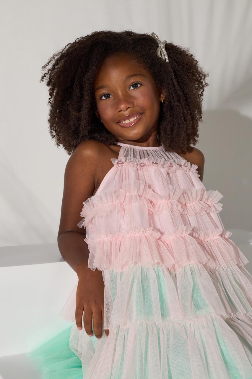 Conheça o Vestido Infantil Evase da Bambollina, um sonho em tule com camadas que fazem um degradê encantador de rosa e verde! Com pedrarias brilhantes no busto, ele é perfeito para pequenas princesas que amam um toque de magia e glamour. Feito 100% em poliéster, é delicado, romântico e pronto para arrasar em qualquer festa.